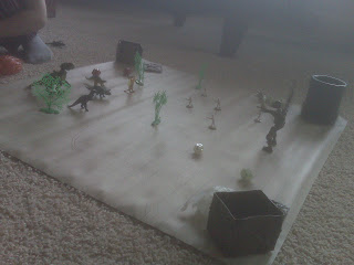 So we flattened it out, as much as possible, utilizing dice cups and crates (props) from our boss minis (they come disassembled in those crates...a kinda cool concept), and started drawing our landscape battlefield. We threw on some trees that came in the bag of dinosaurs for some quick flavor and some obstacles to avoid, and made a cheesy river running thru the middle of the field with a single bridge to cross it. That looked a little weak on the choices of where to move our figs, so I made some dorky little spring-board/teleporter device to use to cross the river too. We also decided that our "flyers" could just fly over the darn thing. Makes sense.